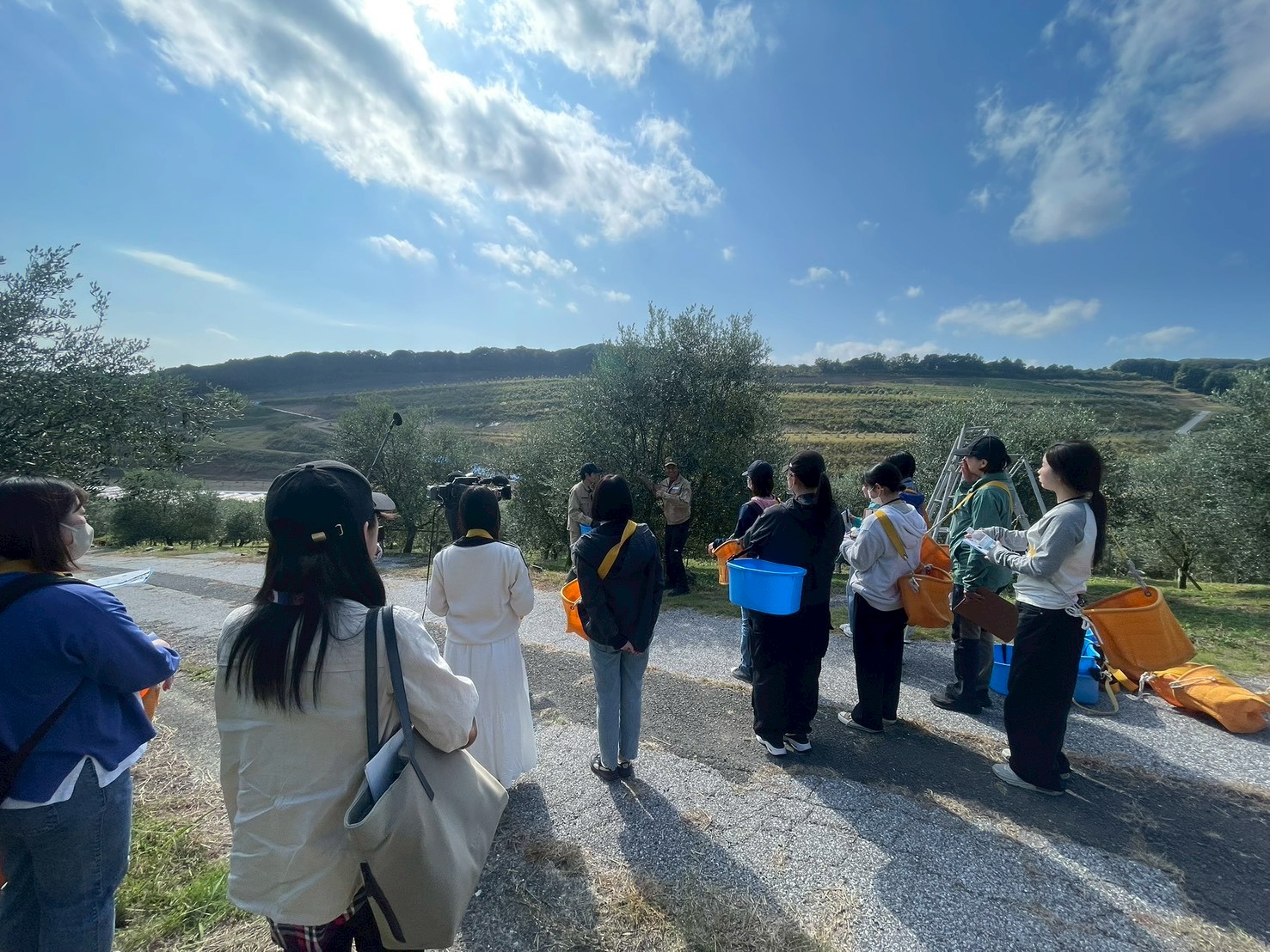 お話の後は、広大な山々に広がるオリーブ畑での収穫体験です。たわわに実ったオリーブを一つひとつ丁寧に摘み取る作業に、参加者の皆さんも没頭。