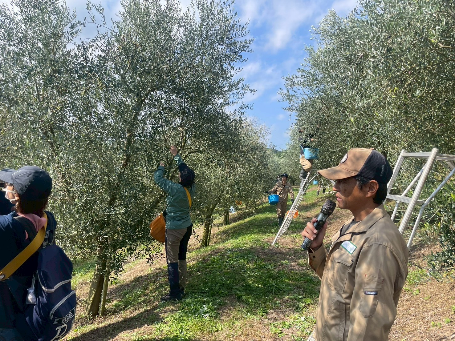 お話の後は、広大な山々に広がるオリーブ畑での収穫体験です。たわわに実ったオリーブを一つひとつ丁寧に摘み取る作業に、参加者の皆さんも没頭。